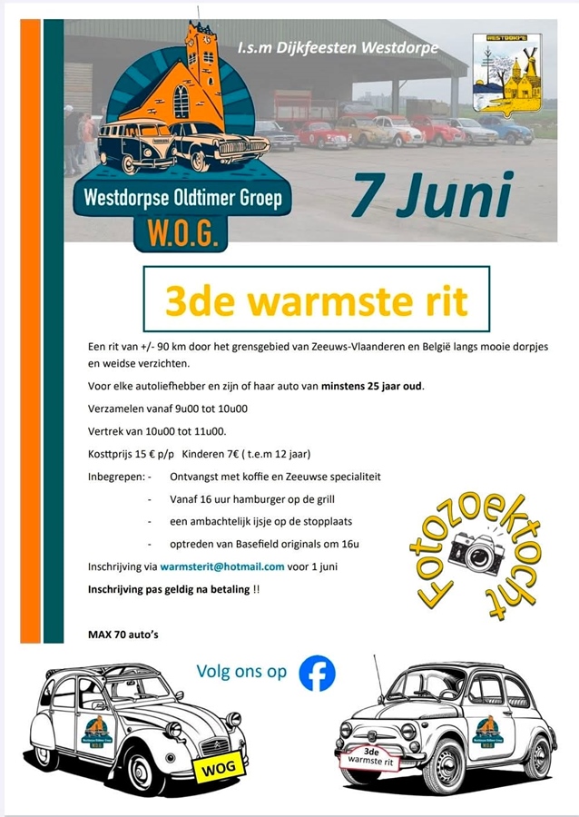 De westdorpse oldtimer groep organiseert voor de 3de een rondrit met fotozoektocht door het grensgebied en zeeuwsvlaanderen over mooie dorpjes en weidse vergezichten. Met achteraf een hapje, drankje en optreden.